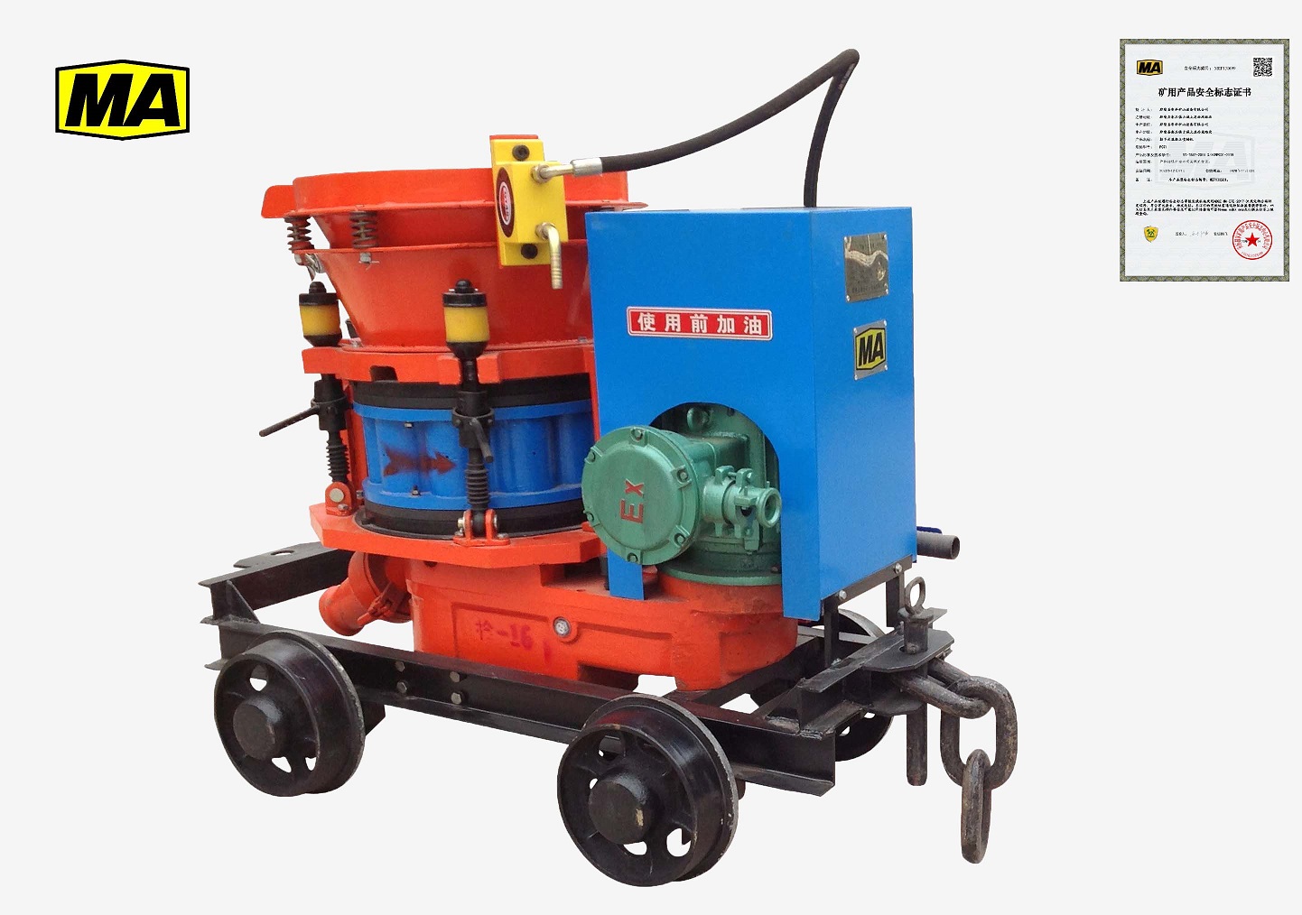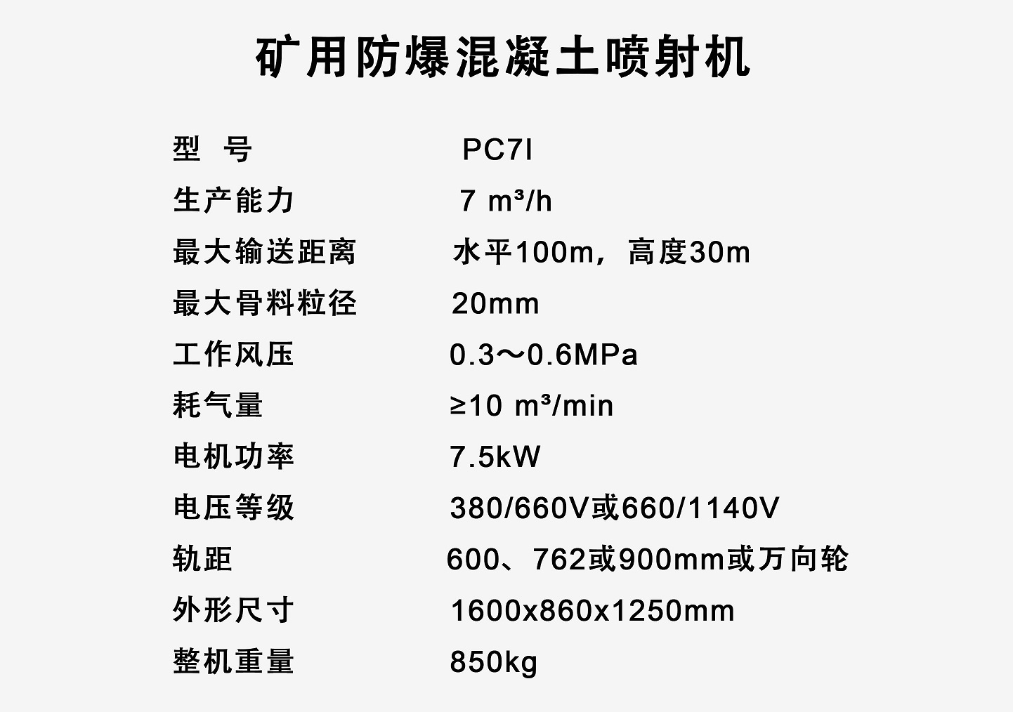 PC7I 转子式混凝土喷射机是潮式混凝土喷射机,该机通过国家矿用产品安全标志中心认证,取得国家煤矿安全标志中心颁发的煤安标志证书,工作电压:380/660V,660/1140V可选。其利用压缩空气,将按一定配比的混凝土拌和料通过管道输送并高速喷射到受喷面上凝结硬化,从而形成混凝土支护层。该机主要应用于煤矿井下、金属矿、隧道、地铁、高沼高粉尘矿井等易燃易爆的危险环境喷浆工作。