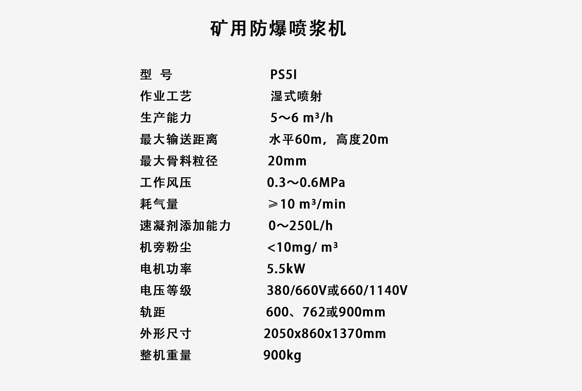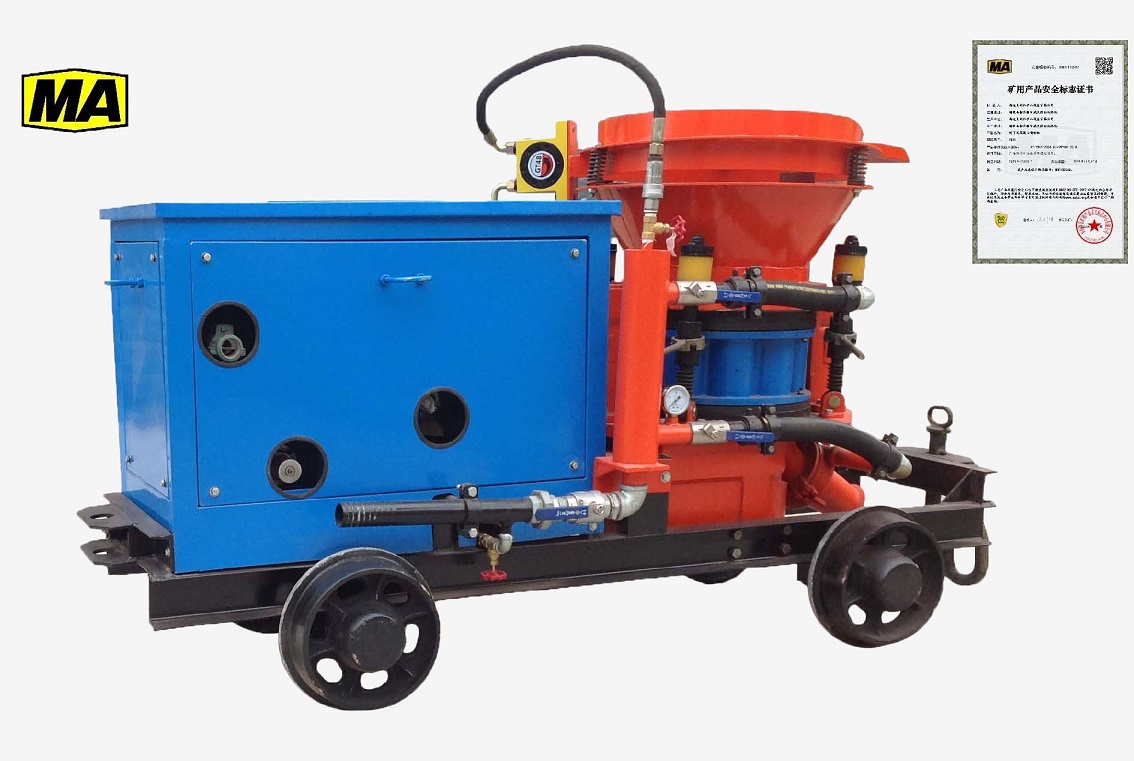 PS系列转子式混凝土喷射机为湿式混凝土喷射机,该机型通过国家矿用产品安全标志中心认证,取得国家煤矿安全标志中心颁发的煤安标志证书,轨轮轨距:600mm,762mm,900mm可选。PS系列矿用喷浆机主要应用于煤矿井下、金属矿、隧道、地铁、高沼高粉尘矿井等易燃易爆的危险环境喷浆工作,其利用压缩空气,将按一定配比的混凝土拌和料通过管道输送并高速喷射到受喷面上凝结硬化,从而形成混凝土支护层。该湿式混凝土喷射机以其先进的喷射方法,可以喷射水灰比大于0.4的湿料,并辅以合适的凝固剂,使砼料能够迅速凝固而不形成流体,该种机型环保无粉尘,大大改善施工作业环境,具有回弹率低,凝固强度高等优点。