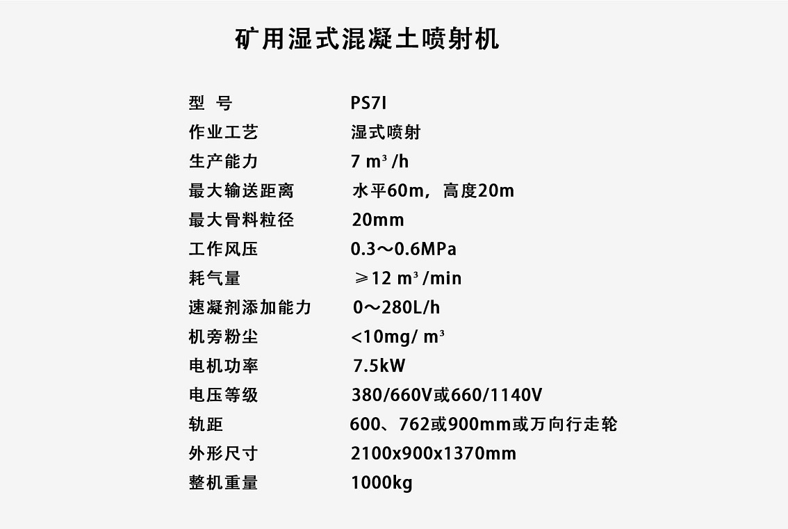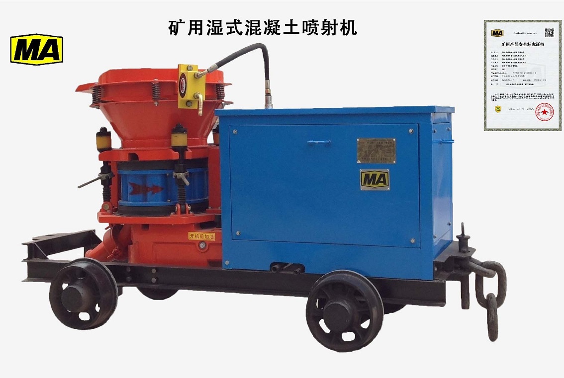 PS系列转子式混凝土喷射机为湿式混凝土喷射机,该机型通过国家矿用产品安全标志中心认证,取得国家煤矿安全标志中心颁发的煤安标志证书,轨轮轨距:600mm,762mm,900mm可选。PS系列矿用喷浆机主要应用于煤矿井下、金属矿、隧道、地铁、高沼高粉尘矿井等易燃易爆的危险环境喷浆工作,其利用压缩空气,将按一定配比的混凝土拌和料通过管道输送并高速喷射到受喷面上凝结硬化,从而形成混凝土支护层。该湿式混凝土喷射机以其先进的喷射方法,可以喷射水灰比大于0.4的湿料,并辅以合适的凝固剂,使砼料能够迅速凝固而不形成流体,该种机型环保无粉尘,大大改善施工作业环境,具有回弹率低,凝固强度高等优点。